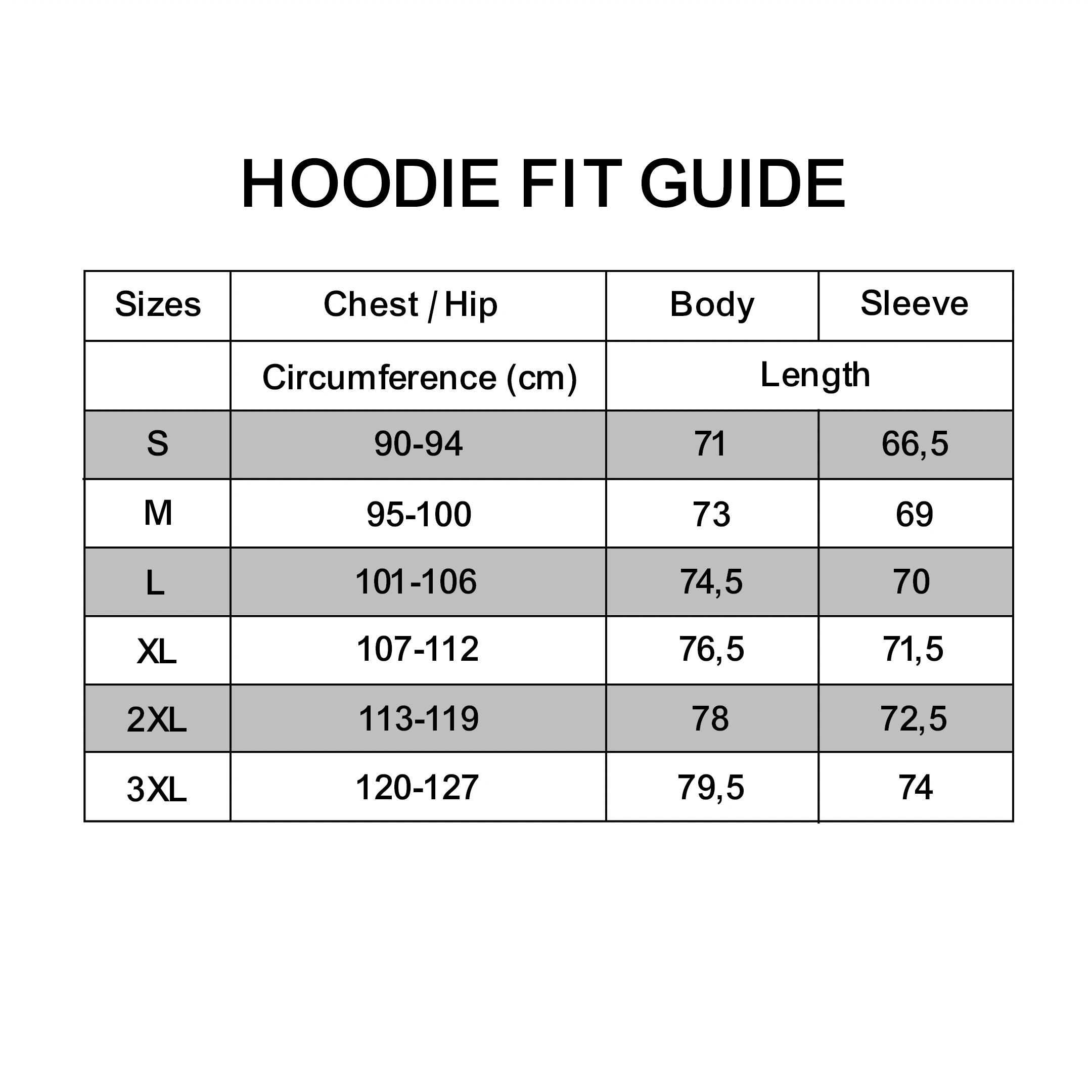 Check body measurements against our Hoodie Fit Guide above.